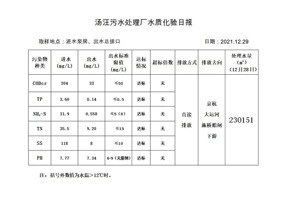 汤汪污水处理厂水质化验日报(2021.12.29)