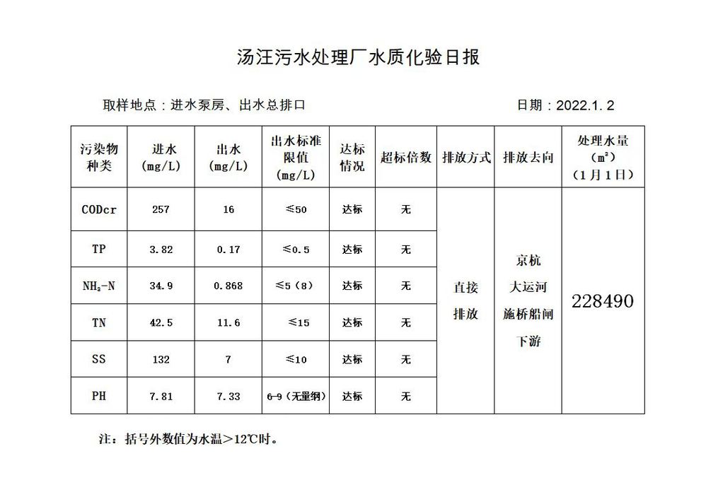 汤汪污水处理厂水质化验日报(2022.1.2)