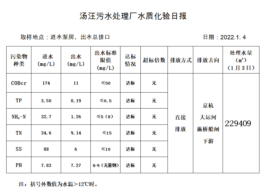 汤汪污水处理厂水质化验日报(2022.1.4)