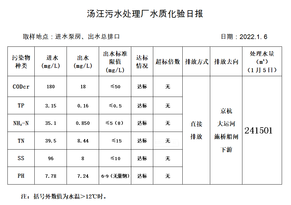 汤汪污水处理厂水质化验日报(2022.1.6)
