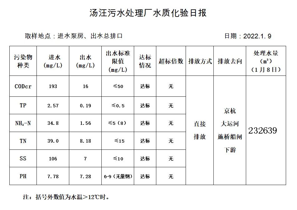 汤汪污水处理厂水质化验日报(2022.1.9)