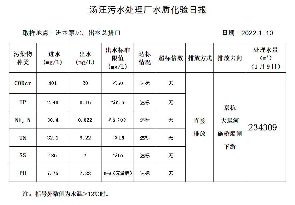 汤汪污水处理厂水质化验日报(2022.1.10)