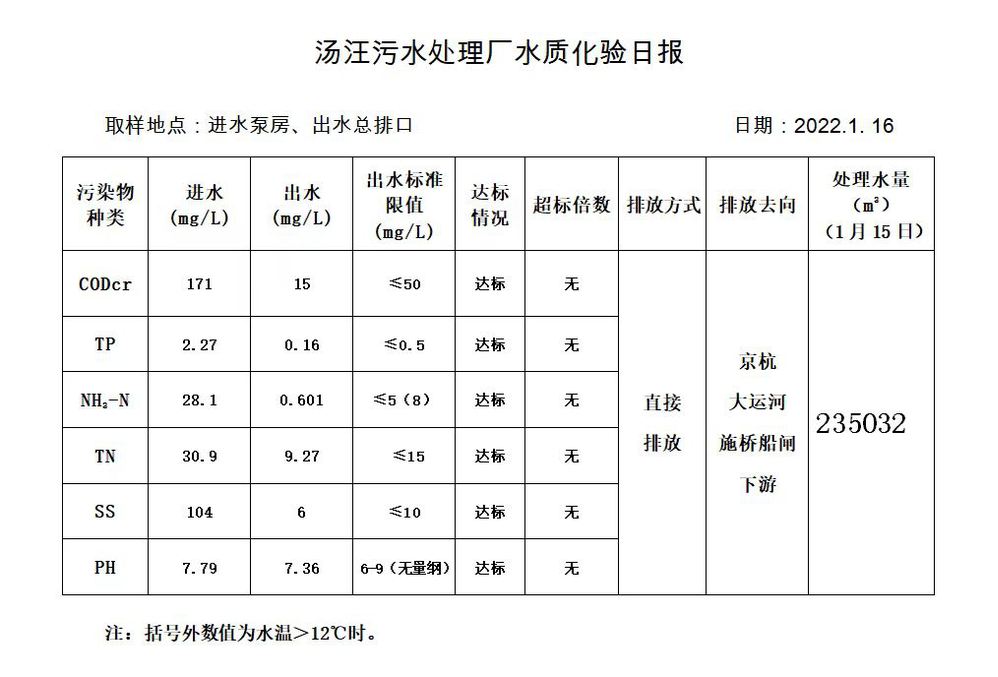 汤汪污水处理厂水质化验日报(2022.1.16)