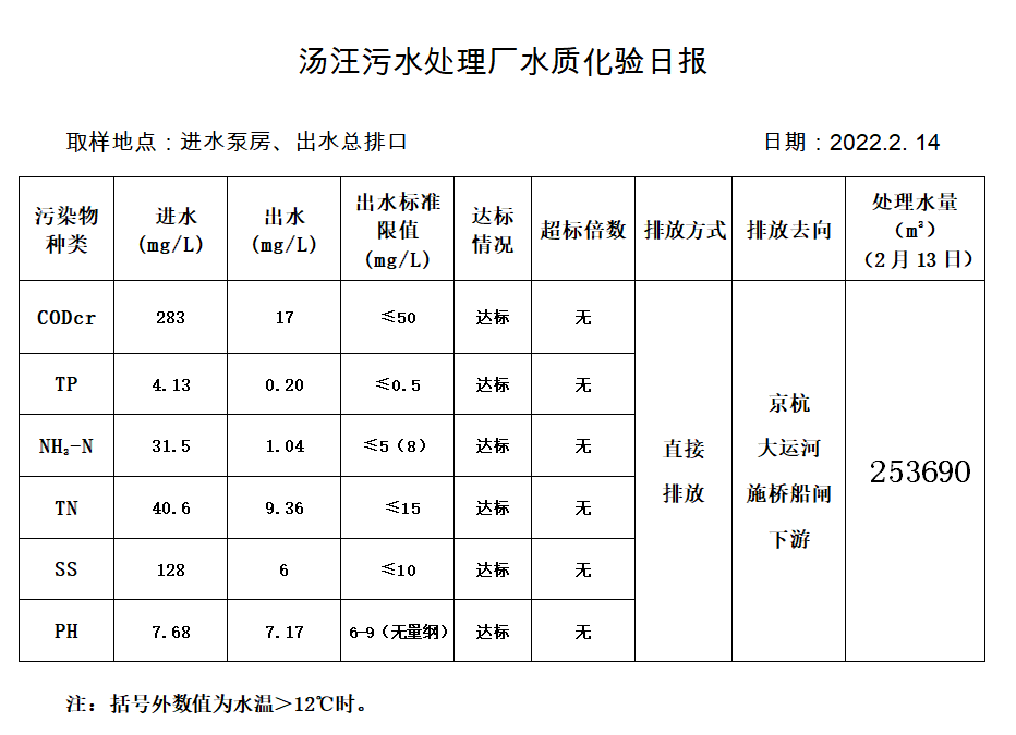 汤汪污水处理厂水质化验日报(2022.2.14)
