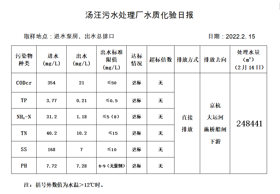 汤汪污水处理厂水质化验日报(2022.2.15)
