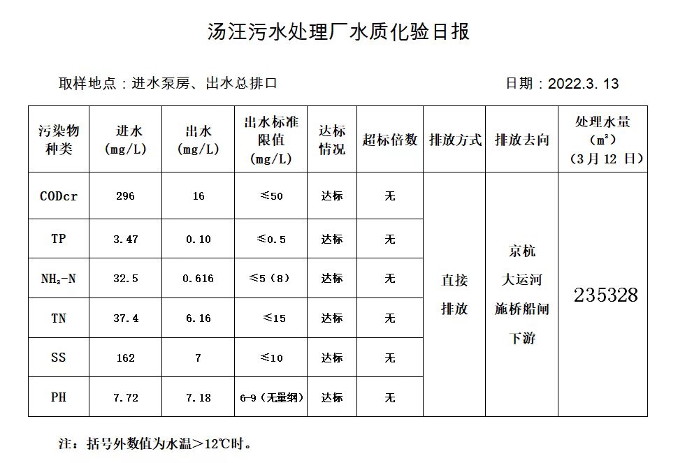 汤汪污水处理厂水质化验日报(2022.3.13)