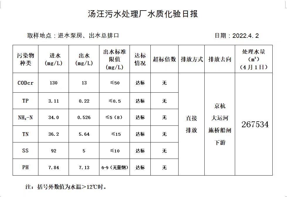 汤汪污水处理厂水质化验日报(2022.4.2)