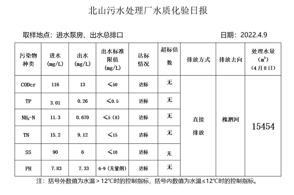北山污水处理厂水质化验日报(2022.4.9)