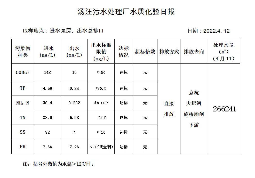 汤汪污水处理厂水质化验日报(2022.4.12)