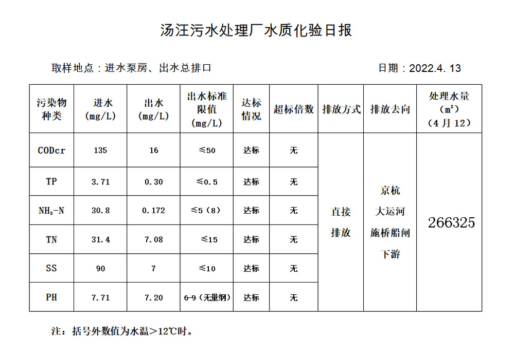 汤汪污水处理厂水质化验日报(2022.4.13)