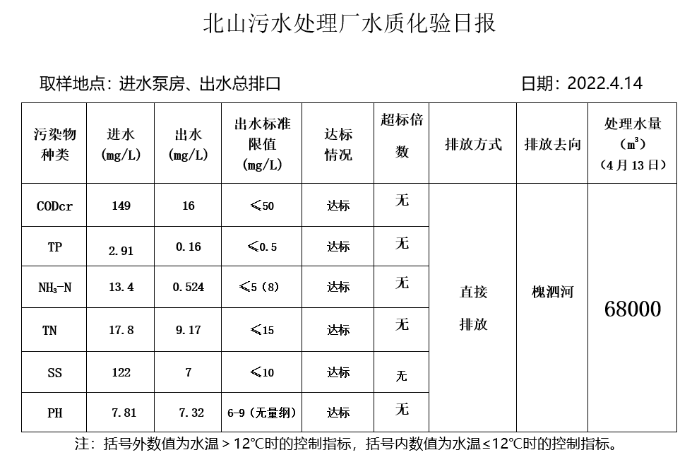 北山污水处理厂水质化验日报(2022.4.14)