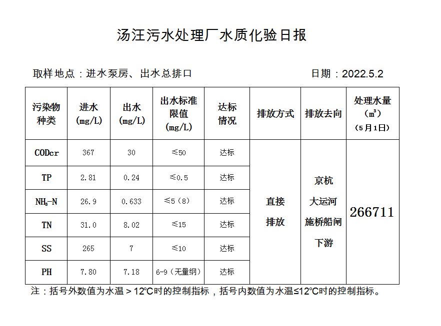 汤汪污水处理厂水质化验日报(2022.5.2)