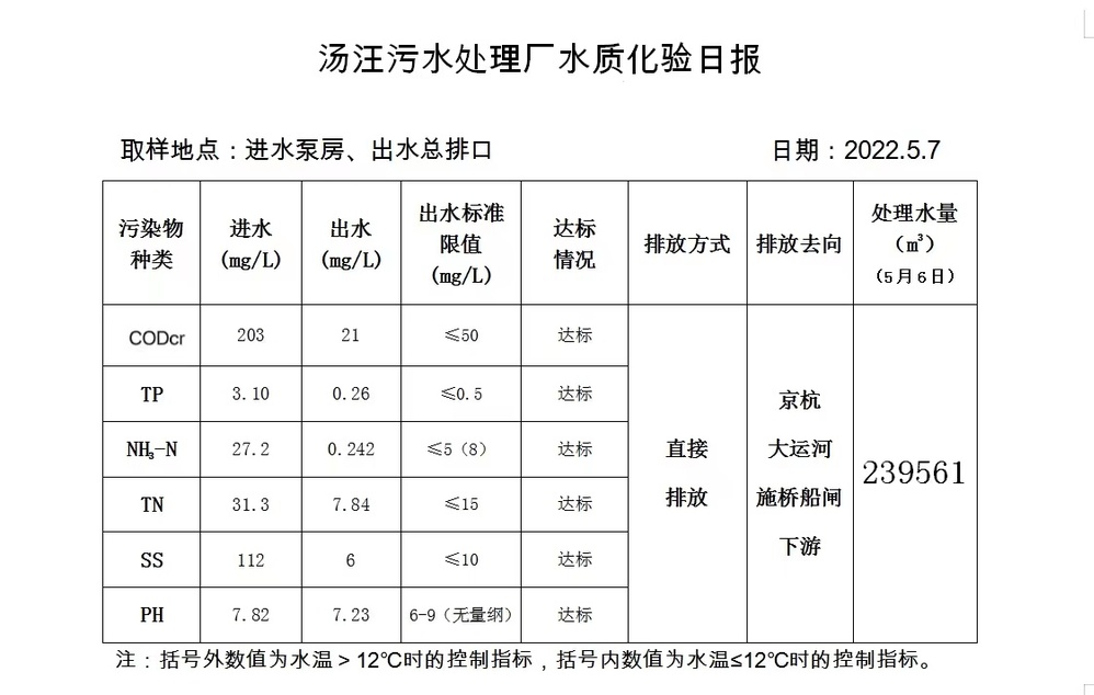汤汪污水处理厂水质化验日报(2022.5.7)