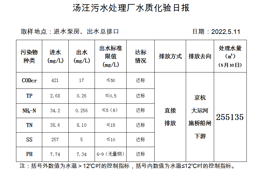 汤汪污水处理厂水质化验日报(2022.5.11)