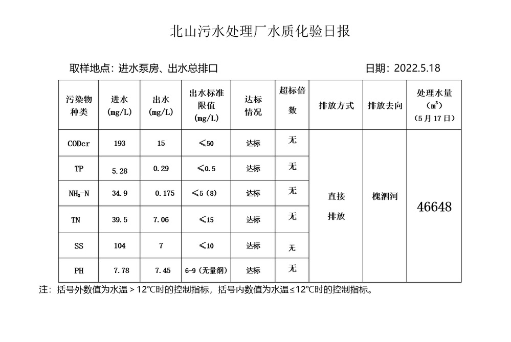 北山污水处理厂水质化验日报(2022.5.18)
