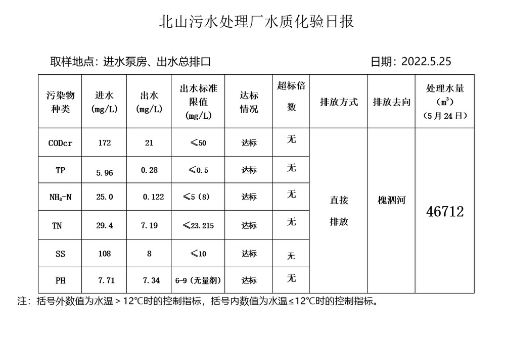 北山污水处理厂水质化验日报(2022.5.25)