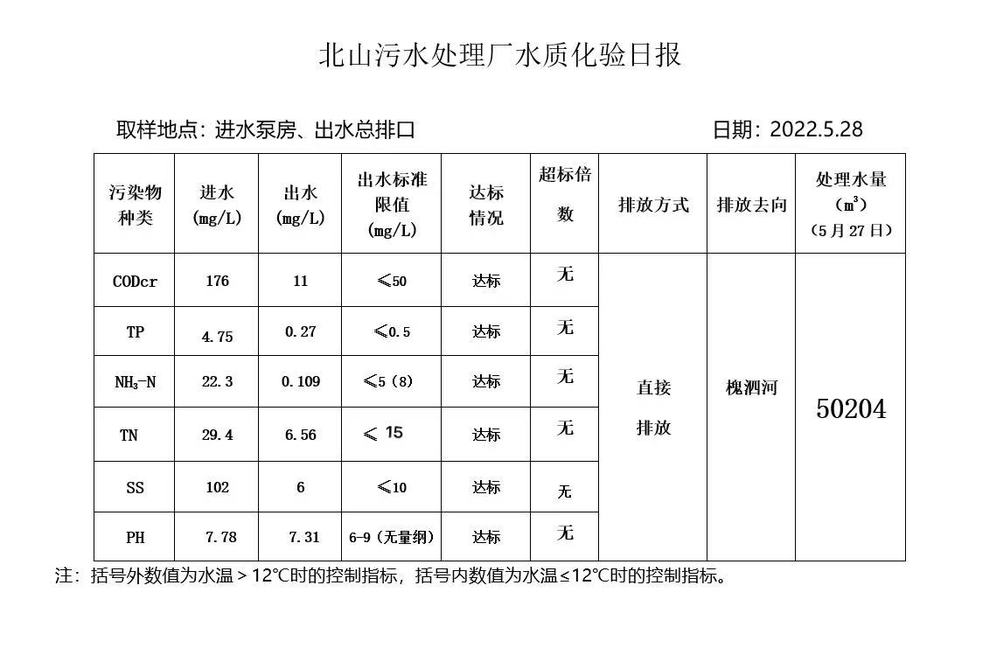 北山污水处理厂水质化验日报(2022.5.28)