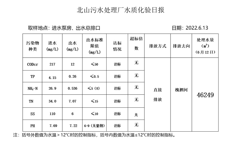 北山污水处理厂水质化验日报(2022.6.13)