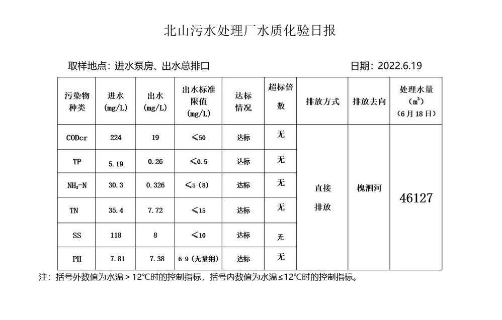 北山污水处理厂水质化验日报(2022.6.19)