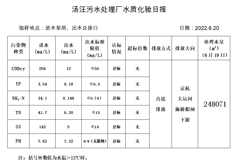 汤汪污水处理厂水质化验日报(2022.6.20)