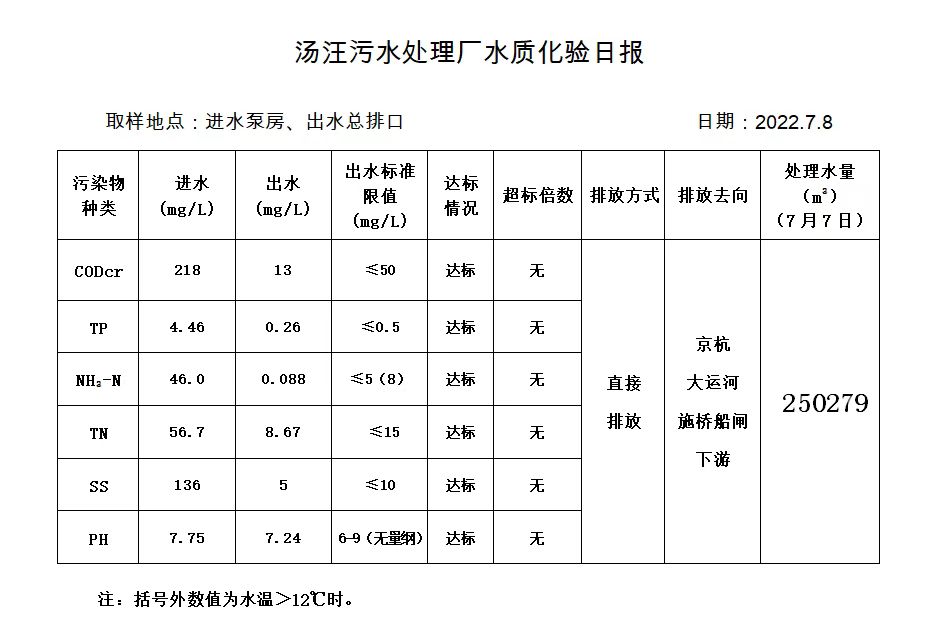 汤汪污水处理厂水质化验日报(2022.7.8)
