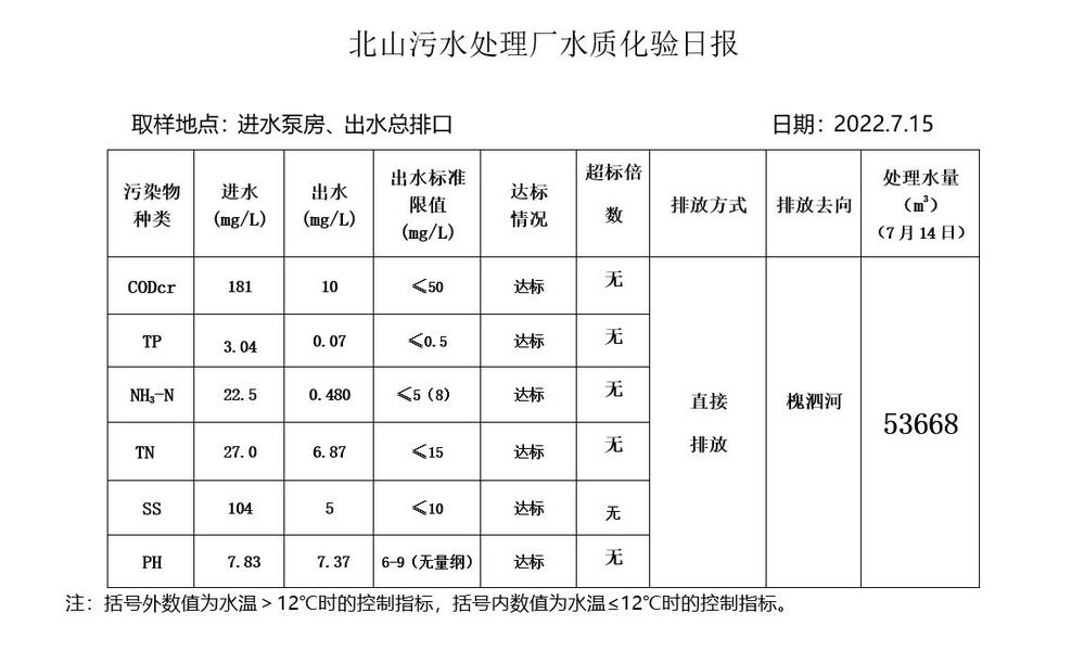 北山污水处理厂水质化验日报(2022.7.15)