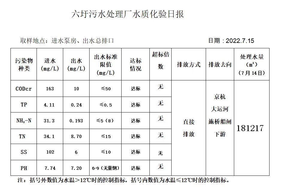 六圩污水处理厂水质化验日报(2022.7.15)