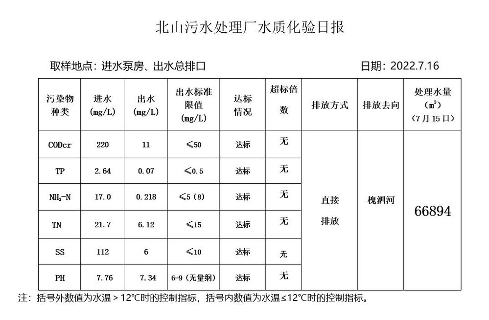 北山污水处理厂水质化验日报(2022.7.16)