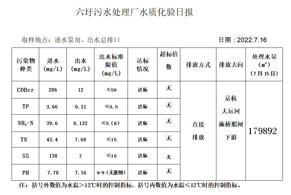 六圩污水处理厂水质化验日报(2022.7.16)