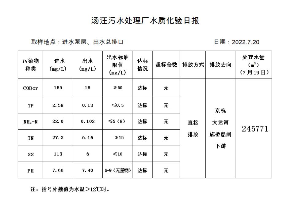 汤汪污水处理厂水质化验日报(2022.7.20)