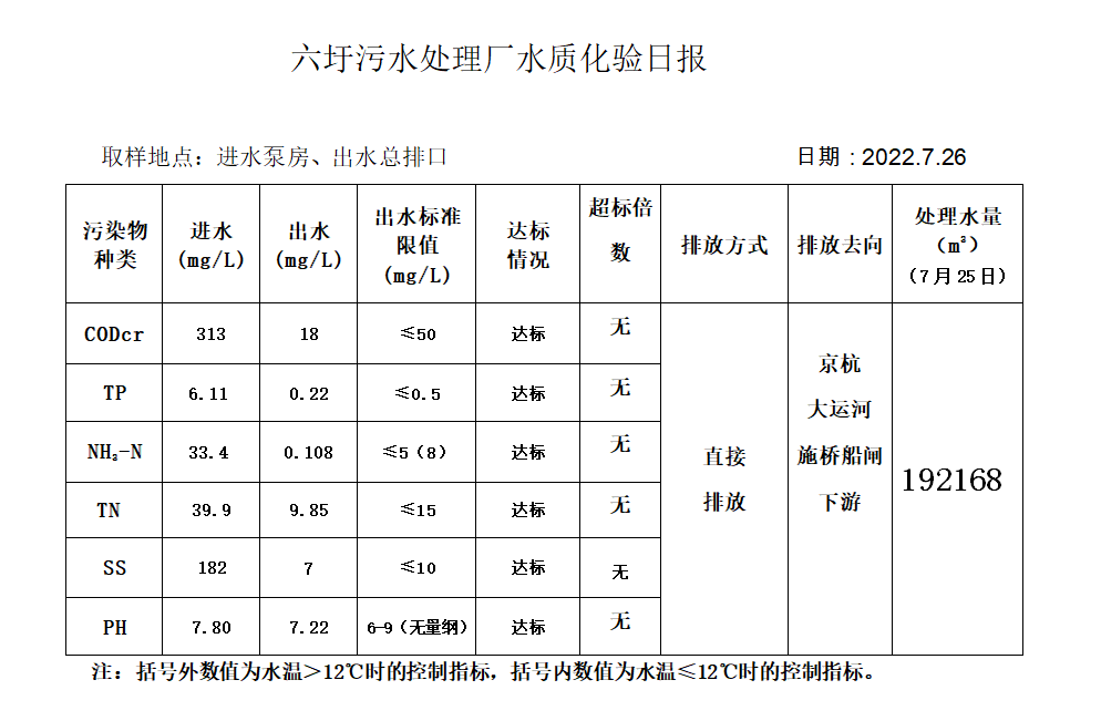 六圩污水处理厂水质化验日报(2022.7.26)