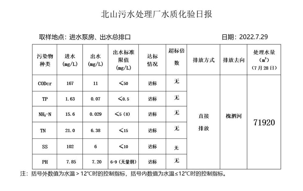 北山污水处理厂水质化验日报(2022.7.29)