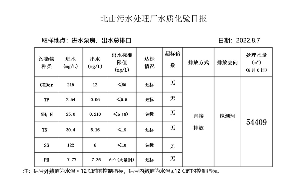 北山污水处理厂水质化验日报(2022.8.7)