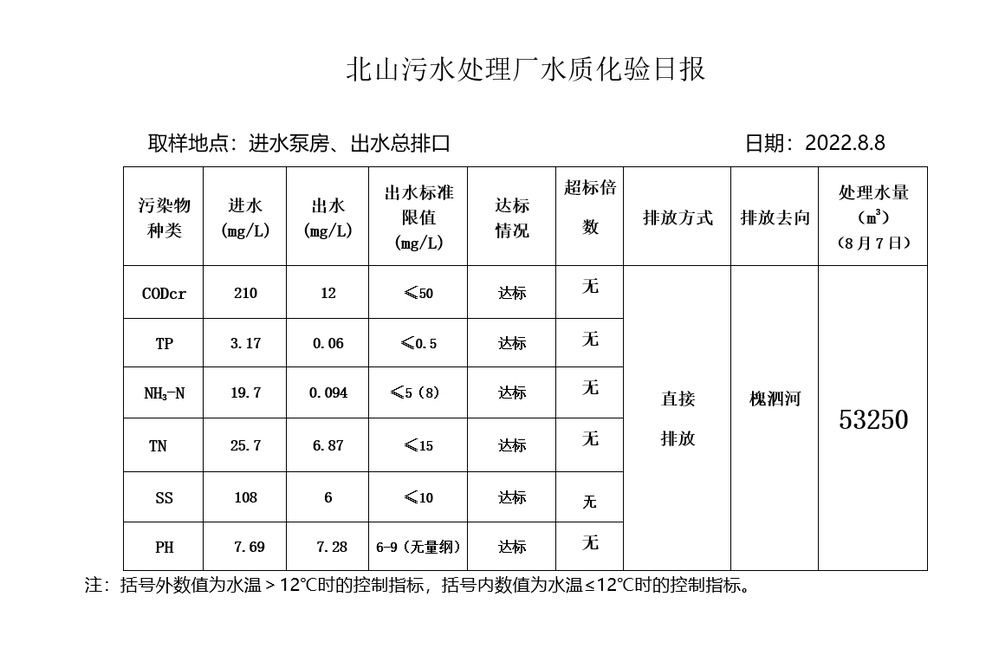 北山污水处理厂水质化验日报(2022.8.8)