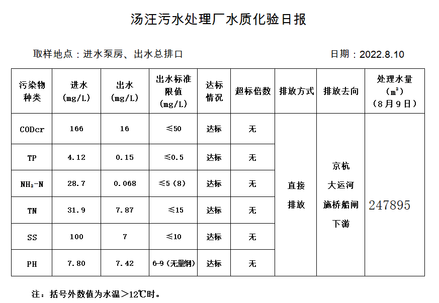 汤汪污水处理厂水质化验日报(2022.8.10)