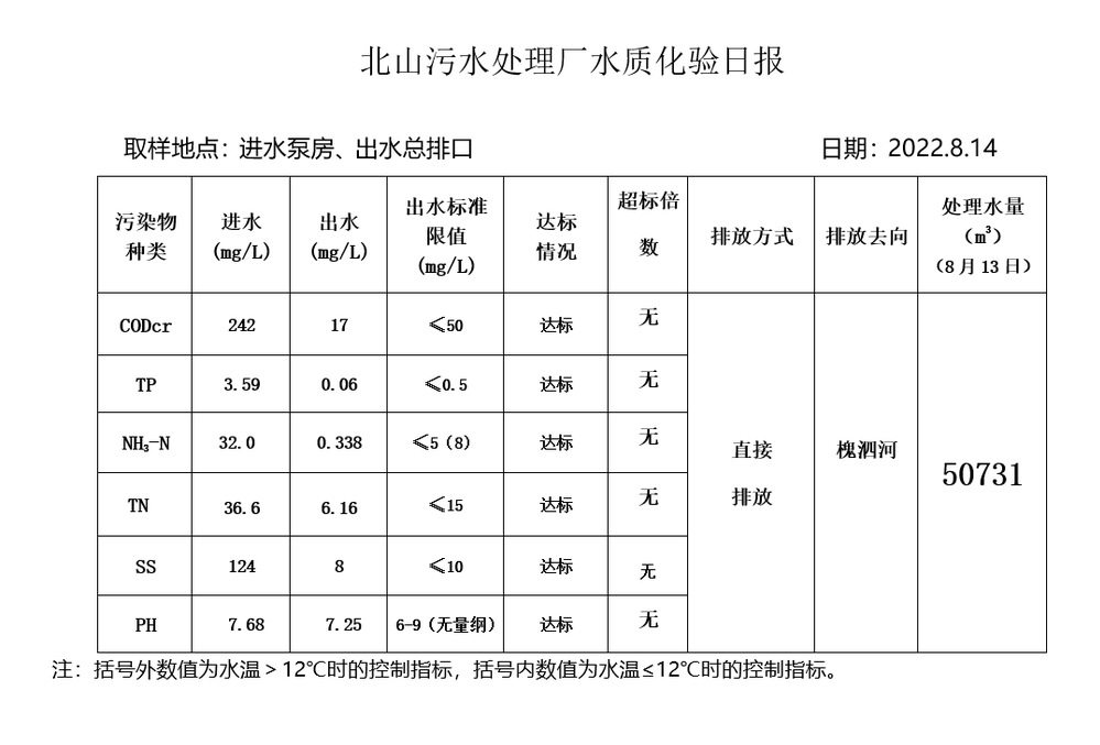 北山污水处理厂水质化验日报(2022.8.14)