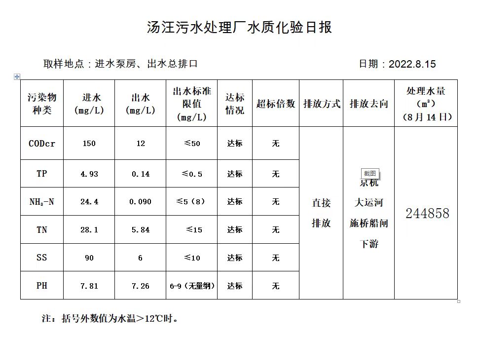 汤汪污水处理厂水质化验日报(2022.8.15)