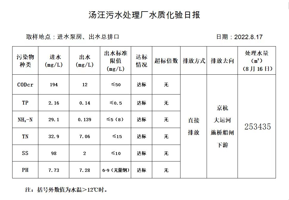 汤汪污水处理厂水质化验日报(2022.8.17)