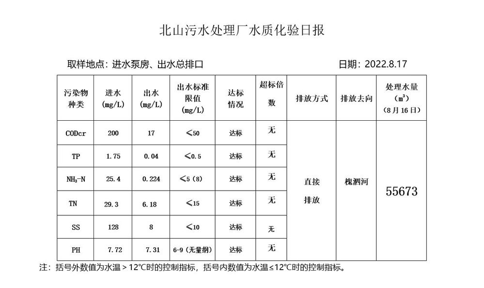 北山污水处理厂水质化验日报(2022.8.17)