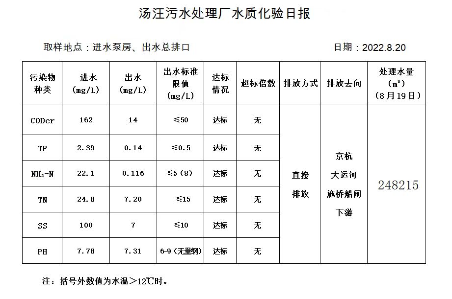 汤汪污水处理厂水质化验日报(2022.8.20)