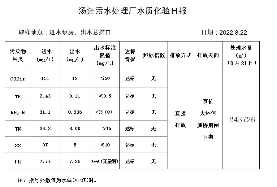 汤汪污水处理厂水质化验日报(2022.8.22)