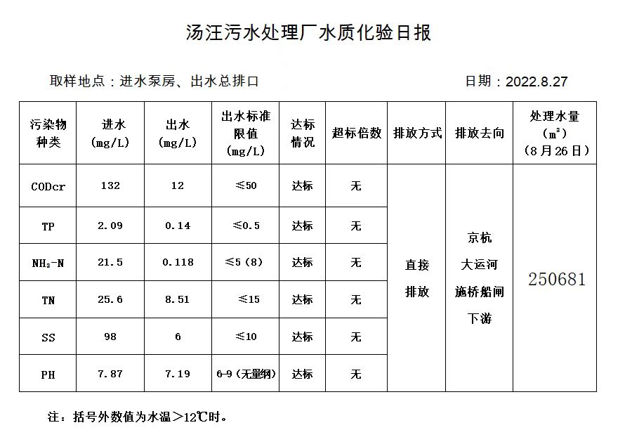 汤汪污水处理厂水质化验日报(2022.8.27)