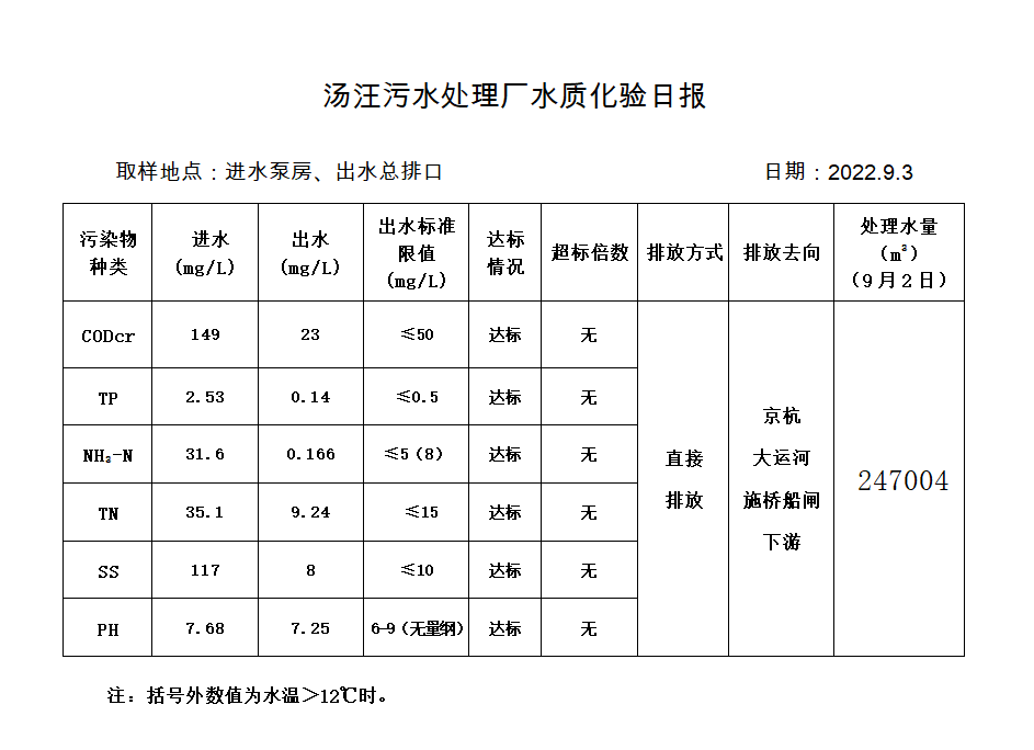 汤汪污水处理厂水质化验日报(2022.9.3)