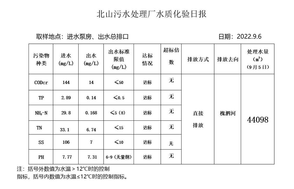 北山污水处理厂水质化验日报(2022.9.6)