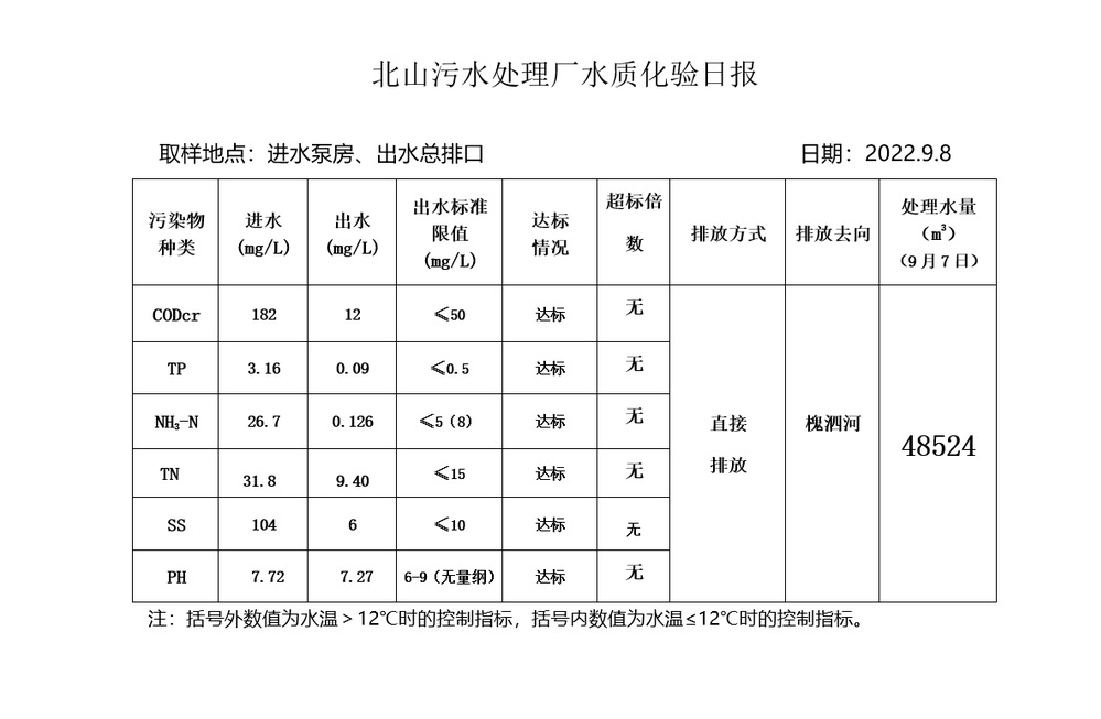 北山污水处理厂水质化验日报(2022.9.8)