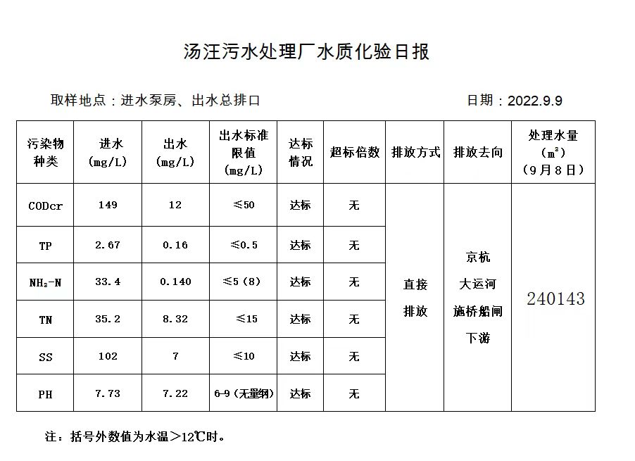 汤汪污水处理厂水质化验日报(2022.9.9)