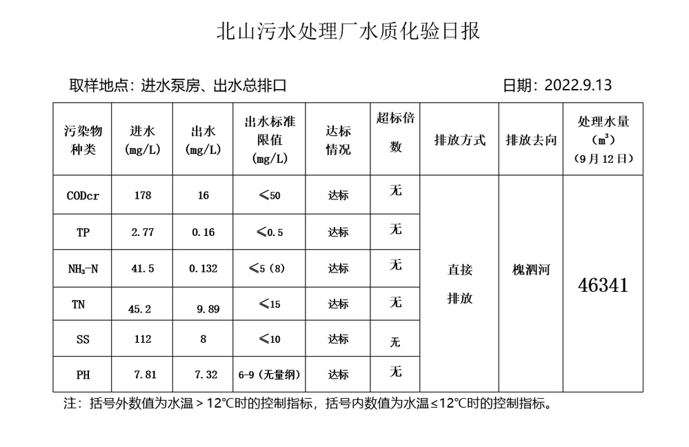 北山污水处理厂水质化验日报(2022.9.13)
