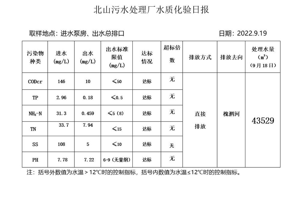 北山污水处理厂水质化验日报(2022.9.19)