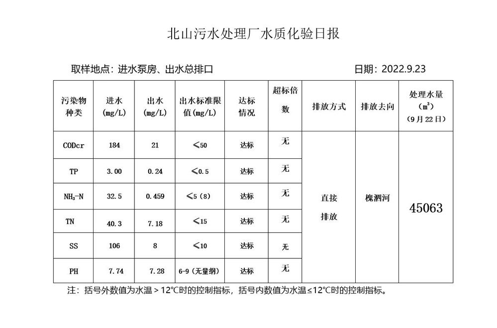 北山污水处理厂水质化验日报(2022.9.23)