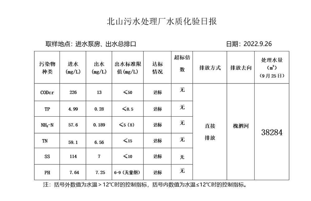 北山污水处理厂水质化验日报(2022.9.26)